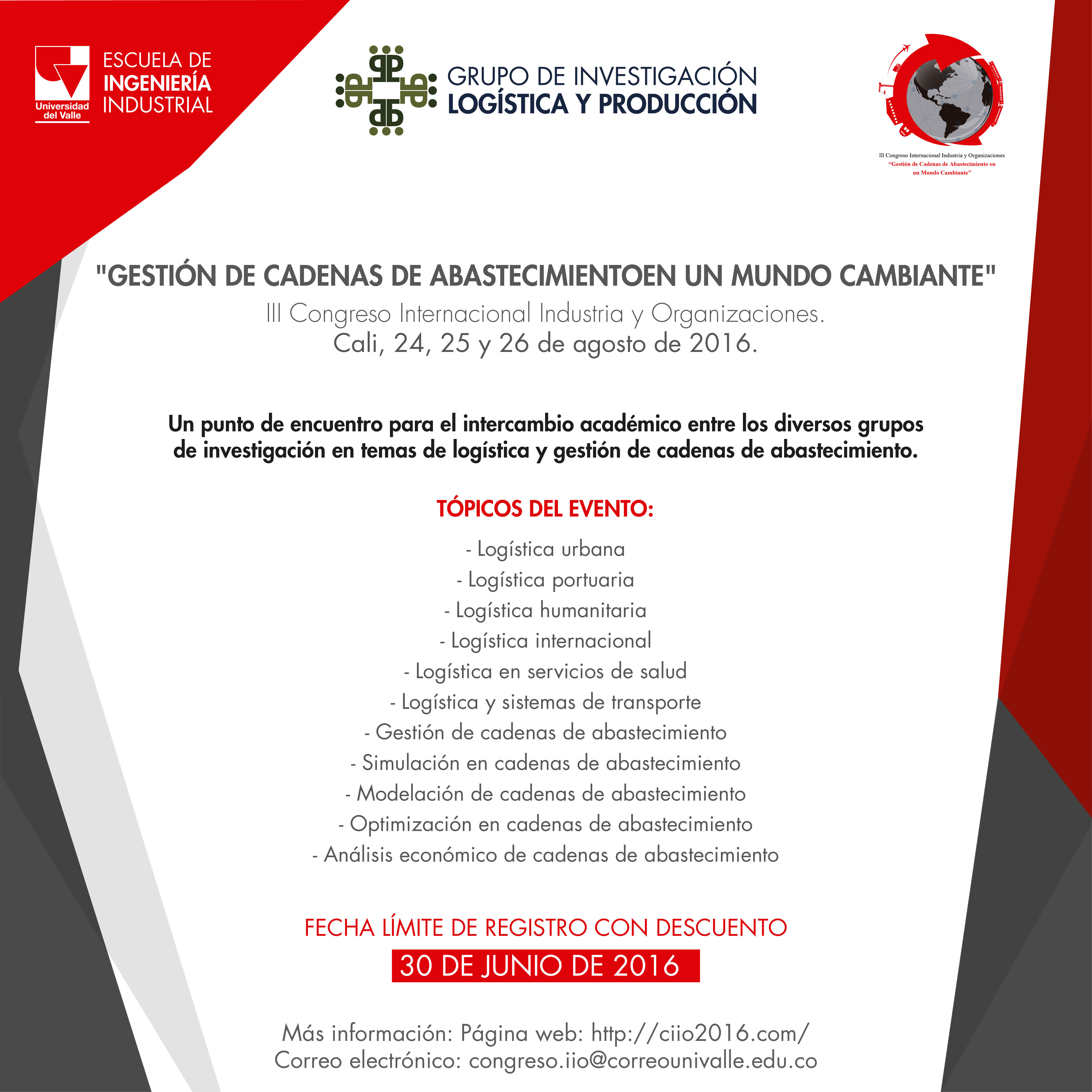 La Escuela de Ingeniería Industrial de la Universidad del Valle como organizadora y anfitriona del congreso, extiende a todos los interesados la invitación para que participen, como ponentes o como asistentes al evento. Estamos seguros de la importancia y las repercusiones que tiene este congreso para la industria y la investigación a nivel nacional e internacional. Para mayor información, pueden ingresar a la página donde encontrarán todo lo relacionado con el CIIO 2016 y las fechas importantes para que las tengan muy en cuenta. Los esperamos.