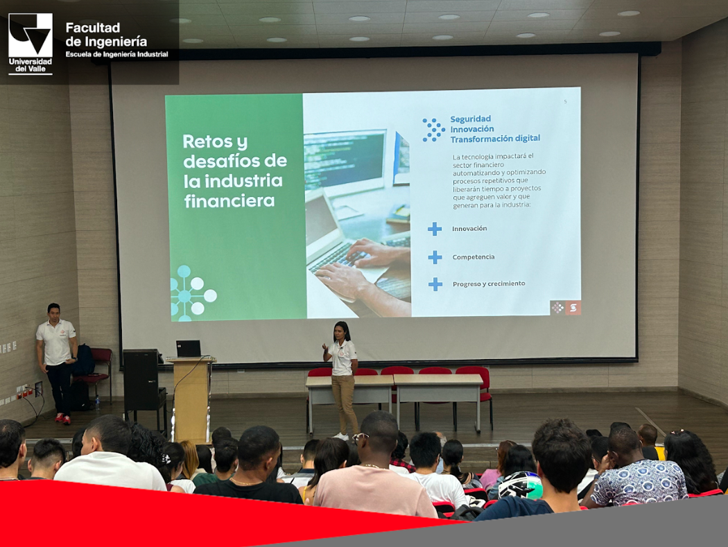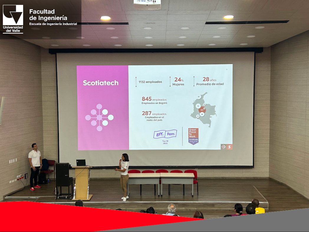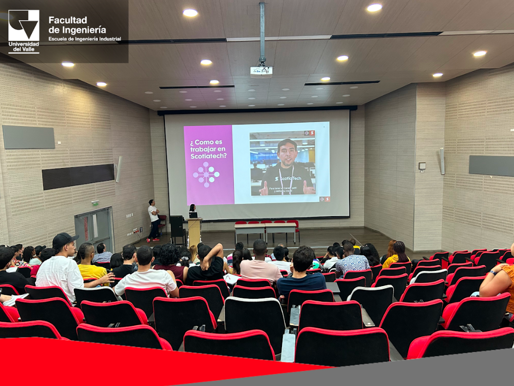 El pasado 5 de abril, los estudiantes de pregrado de la Escuela de Ingeniería Industrial asistieron a la charla “Navigating the future: Tecnología en la industria financiera”, dictada por Linda de la Barrera, Senior Manager Service Desk en ScotiaTech. Junto a ella también estuvo el Senior Manager Development, Iván Salazar Ramos, egresado de la Universidad del Valle, y Danilo González Ascencio, Senior VP, Managing Director en ScotiaTech.