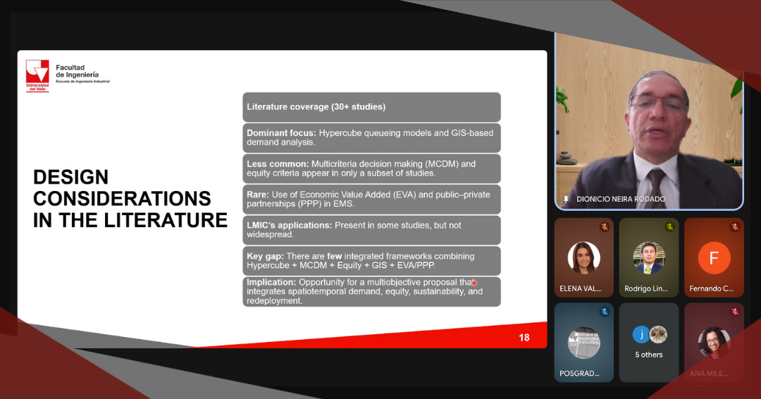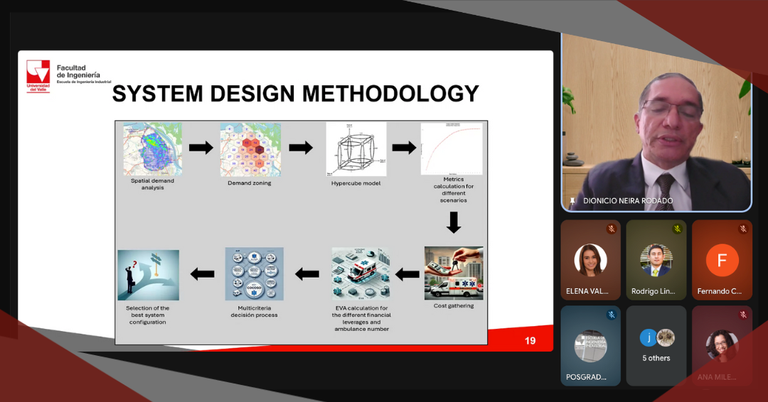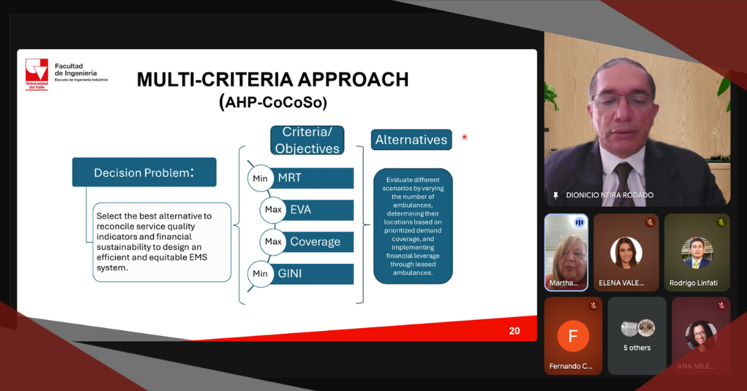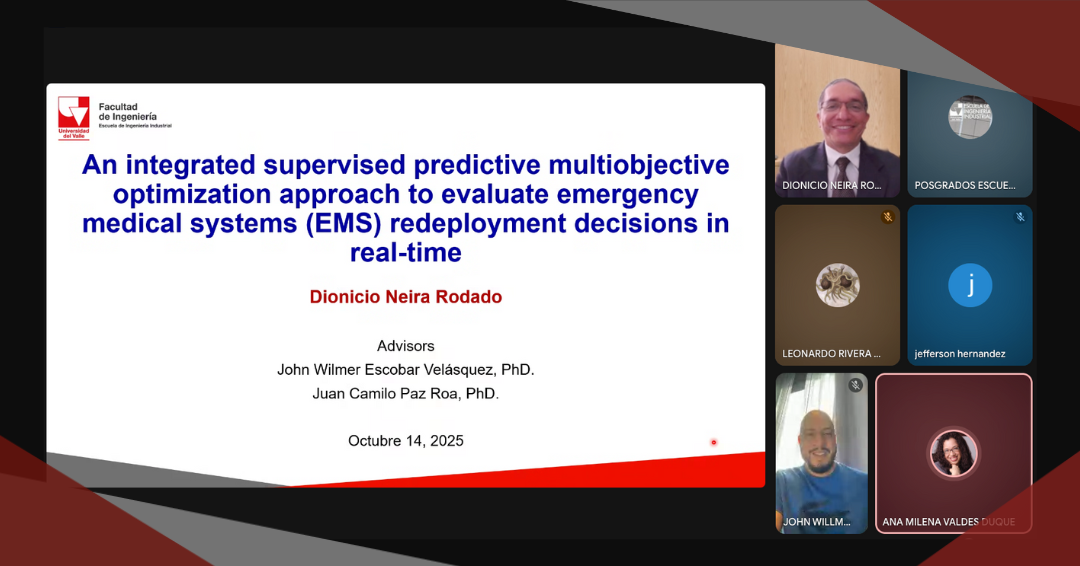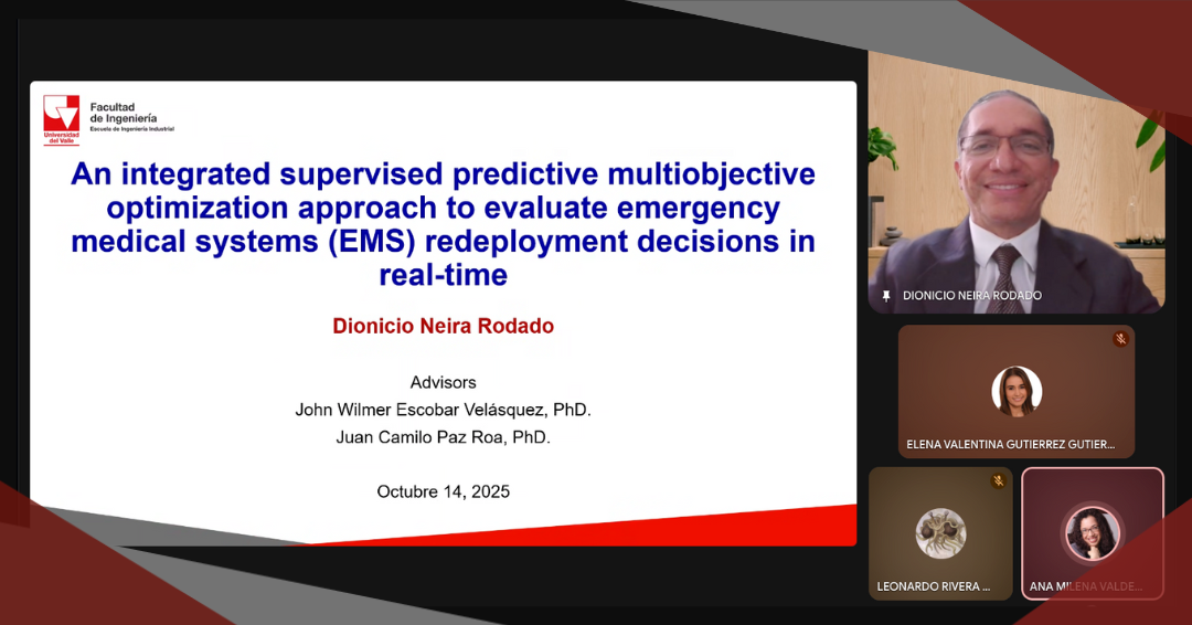 El pasado martes 14 de octubre, en sesión virtual, nuestro estudiante Dionicio Neira Rodado sustentó su tesis doctoral titulada: “An integrated supervised predictive multiobjective optimization approach to evaluate emergency medical systems (EMS) redeployment decisions in real-time” . Sus directores fueron los profesores: John Wilmer Escobar Vásquez, Ph.D., profesor titular de la Facultad de Ciencias de la Administración de la Universidad del Valle y Juan Camilo Paz Roa, Ph.D., profesor del Departamento de Ingeniería Civil e Industrial de la Pontificia Universidad Javeriana, Cali.