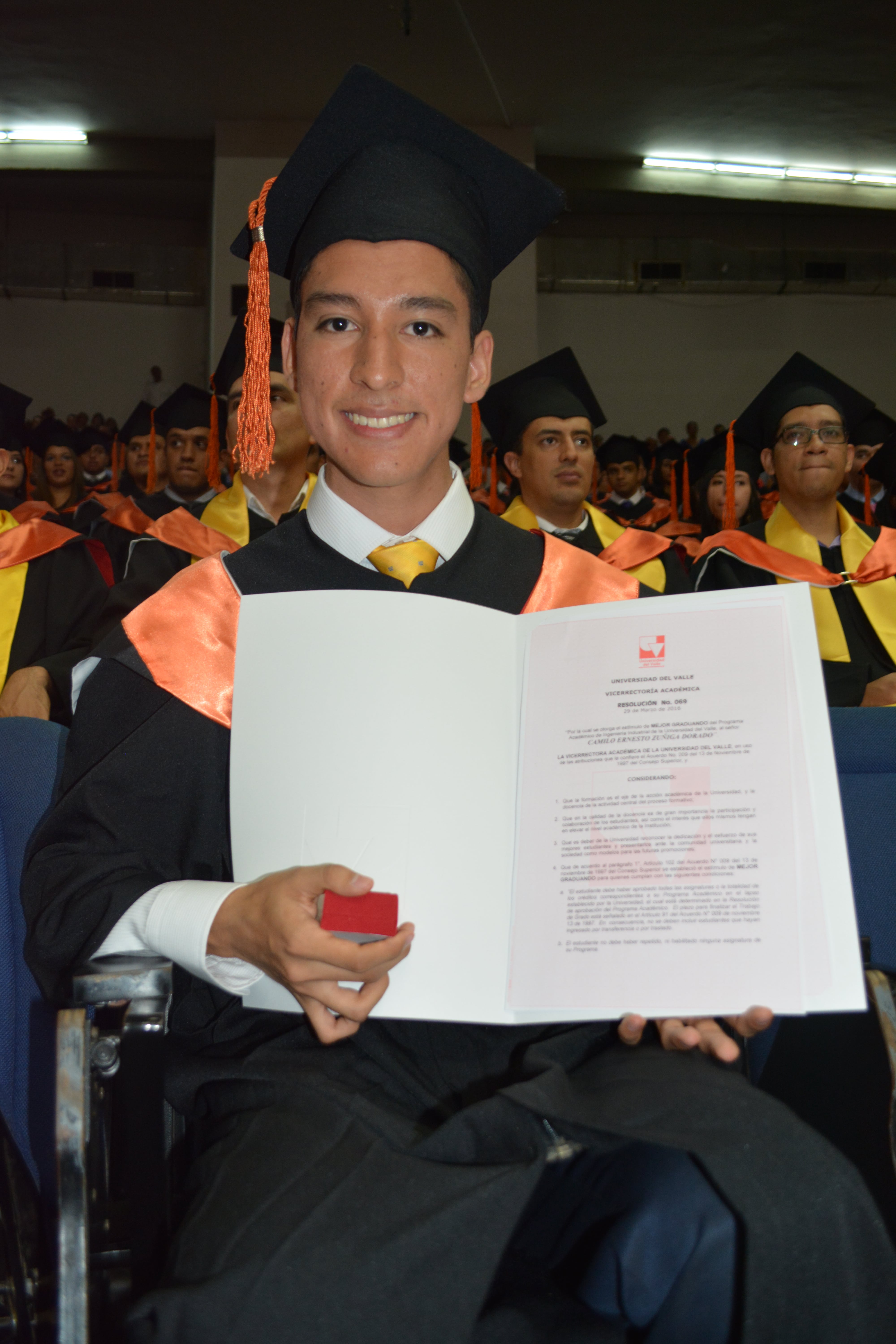 Mientras hacía la fila para el primer desfile, durante la ceremonia de graduación, inesperadamente se acercaron a él y le notificaron que era el mejor graduando de la Facultad de Ingeniería de la Universidad del Valle. Para Camilo Zúñiga fue una total sorpresa, a tal punto, que su mente quedó en blanco y temblaba de nervios al recibir el galardón. Un promedio acumulado de 4.4 y el haber terminado su pregrado en el tiempo que la universidad establece, sin ninguna sanción disciplinaria o académica, le hicieron merecedor de tan alto prestigio. Al preguntarle qué fue lo que hizo posible llegar a ser el mejor, nos dice que fue su familia, la cual cada día lo ha apoyado desde Popayán y Cali; durante 5 años eso fue lo que lo mantuvo firme, tras tomar la decisión de vivir en otra ciudad, siendo tan joven, el amor y confianza que le brindaron, hicieron más fácil el estar lejos haciendo lo que más le apasionaba.
