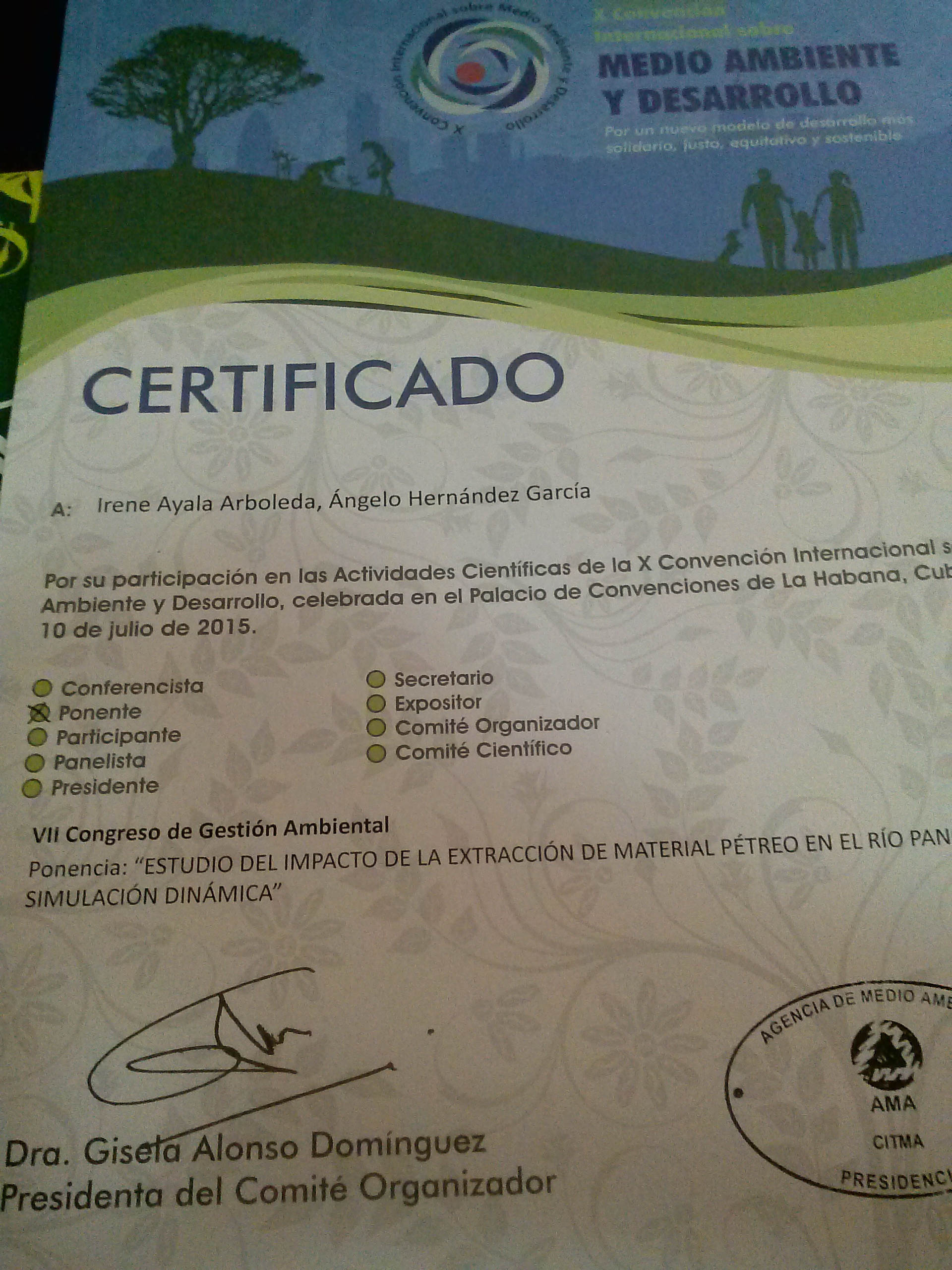 Nuestro estudiante Ángelo Hernández que cursa octavo semestre, llegó hace algunos días al país luego de presentar una ponencia en la 10º Convención Internacional sobre Medio Ambiente y Desarrollo en la Habana, Cuba, que se realizó entre el 6 y 10 de julio del 2015. La ponencia recibe como nombre "Estudio del Impacto de la Extracción de Material Pétreo en el Río Pance Mediante Simulación Dinámica”. El trabajo fue realizado en compañía de la estudiante de Ingeniería Agrícola Irene Ayala Arboleda, quién junto a Ángelo estuvo participando y representando a la Universidad del Valle en este importante evento al que acudieron profesionales y académicos de distintas áreas relacionadas con las ciencias ambientales. |